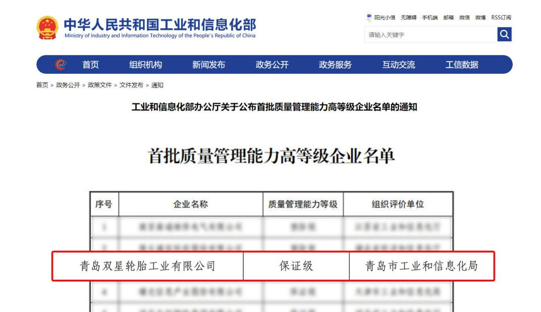 行業(yè)唯一!雙星輪胎入選工信部質(zhì)量管理能力高等級企業(yè)名單